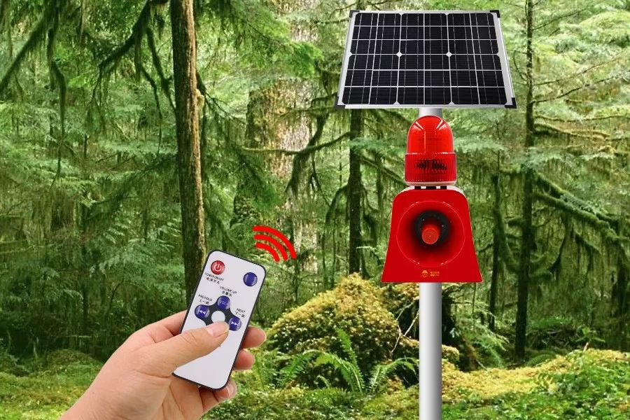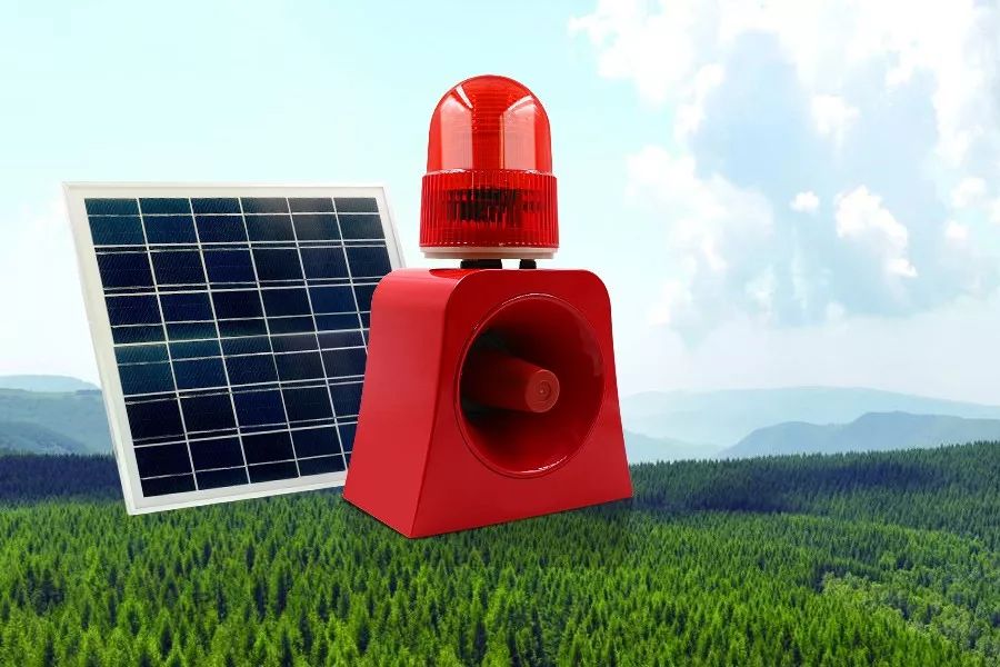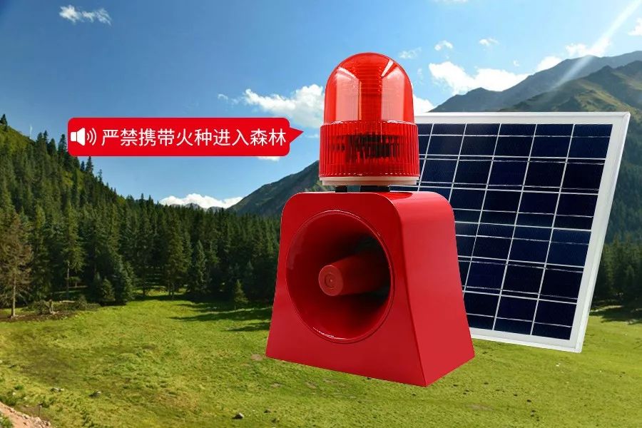 当人员上山时,声光报警装置通过微波感应,检测到人员靠近时,随即声光报警,发出警示,(语音内容可以个性化定制),通过听觉与视觉双重提醒,来告知人员注意事项,起到防患于未然的效果,此款声光报警装置还可以外加太阳能,因为常年使用于野外环境,供电麻烦,可通过太阳能供电,解决供电难问题。