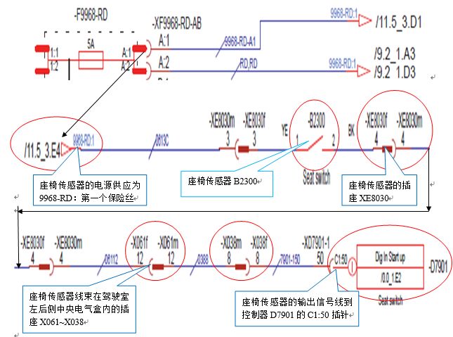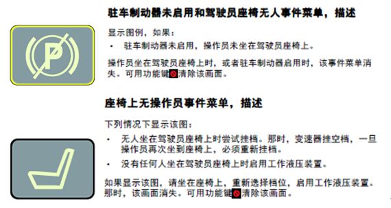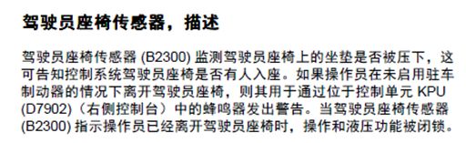 根据手册描述,故障均和驾驶室座椅底部传感器有关。继续查阅手册资料,关于驾驶室座椅传感器说明如下: