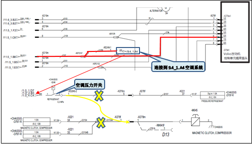 如上图红色线,原车往6号线供电的线路上还有一个分支前往空调压力开关,仅仅是顺带给后KDU提供空调压力开关的状态信号。而现场检查发现,原车空调压力开关到后KDU的线路以及后KDU到空调压缩机的线路被剪断,又把XS246-2和X278M 直接连接起来,如上图黄色标记,至此问题根源找到。