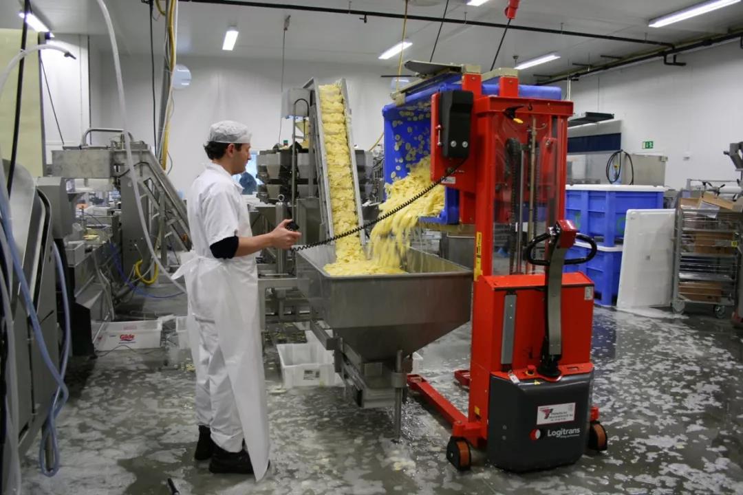 这是一个国外的食品行业案例,操作员正在使用乐吉腾箱体翻转车,将一箱箱土豆片儿倾倒流水线上。使用配备的有线遥控器,精准控制翻转角度。