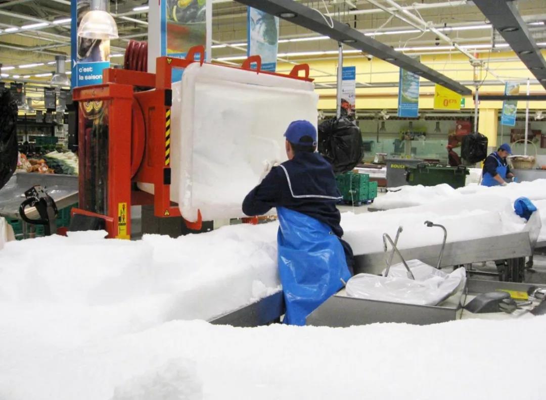取料困难也可以找乐吉腾箱体翻转车来帮忙!这是一个生鲜运输行业,利用箱体翻转车,将装满冰的箱子抬起,并翻转90°,工人才能将里面的冰块铲到工作台上。