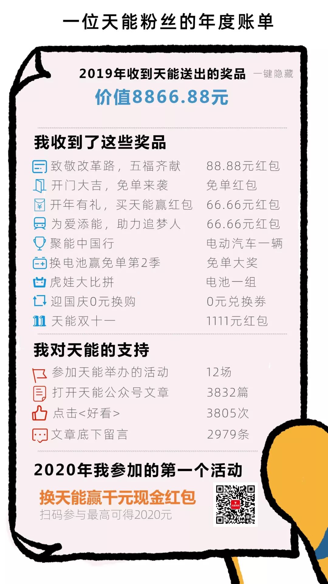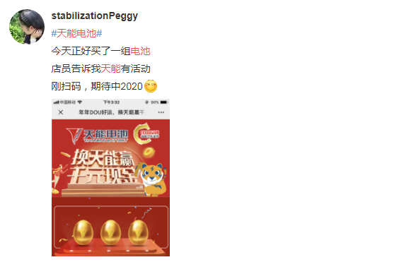截止目前,全国500多个城市,近40万家终端门店举办了换电池赢千元现金活动,近300万消费者参与了扫码抽奖。2020天能第一波活动反响热烈,线上线下齐发力,真真切切为消费者带去福利。