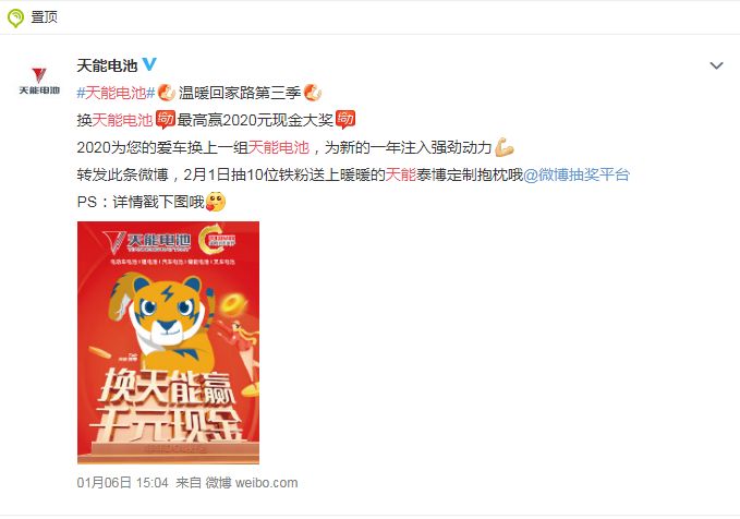 进入微博#天能电池#话题页,参与置顶的微博活动,转发天能电池原博,说说你对天能电池的印象,2月1日小编还将抽出10位铁粉送上天能泰博定制抱枕哦!