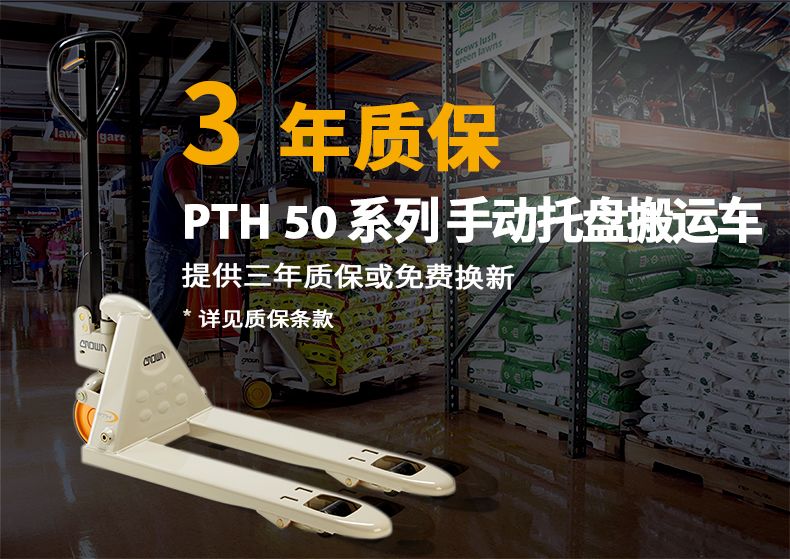 2020年,Crown-科朗为标准型号 PTH 系列手动托盘车提供 3 年质保!即日起,凡是通过指定渠道购买,即可享受 3 年质保服务!