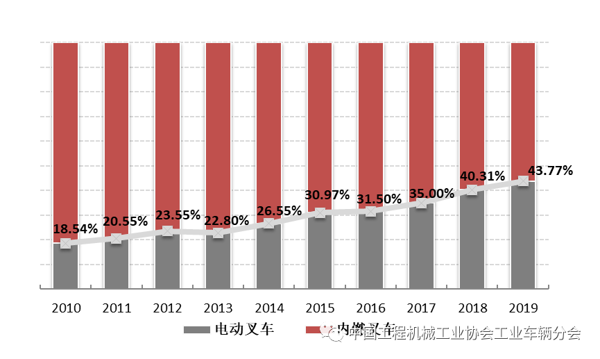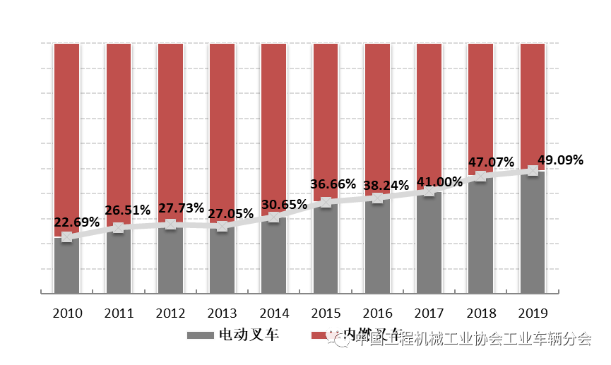 2010年至2019年总销售量中电动叉车占比情况如下图: