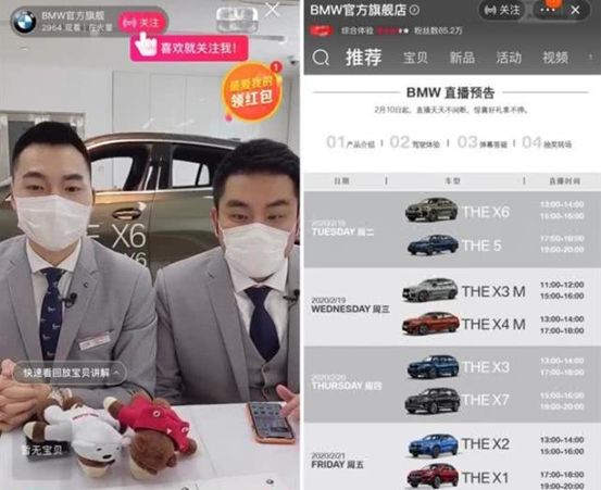 此外,就连宝马这样的豪华品牌也开始放下身段,加入到汽车行业直播大军中。宝马的天猫官方旗舰店和京东官方旗舰店,每天开设专场直播,同时设立了“在线展厅”,在直播平台首页,宝马官方直播购车的广告赫然而立,针对不同车型,宝马每天都会安排4场直播。点进直播间,两位“BMW产品精英”戴着口罩正襟危坐,为客户带来相应车型的产品解读。直播形式像是一场问答会,主要解答观众对车辆本身提出的疑问。