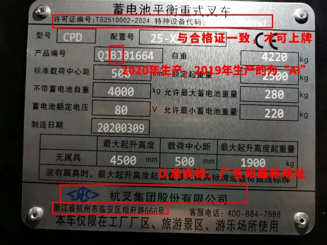 如果您买的是电动叉车,可以通过查看叉车上的铭牌信息里进行鉴别: