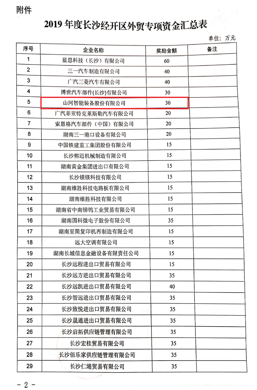 近日,长沙经济技术开发区官网发布《关于长沙市2019年外贸发展专项资金安排的公示》、《关于2019年度长沙经开区外贸专项资金安排的公示》,山河智能喜获58.66万元外贸专项资金奖励。