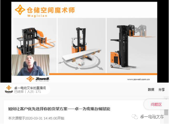3月31日,卓一叉车首场云直播服务隆重登场,以货架行业为特定对象,卓一叉车总经理潘总进行了精彩的分享,吸引了共计百余人次的在线观看和互动。以三向叉车产品介绍为主,结合实际操作案例,实用、易懂的直播内容让大家在货架仓储物流解决方案产品选型上有了更多的认识,新颖的直播的方式也受到了大家的一致认可。
