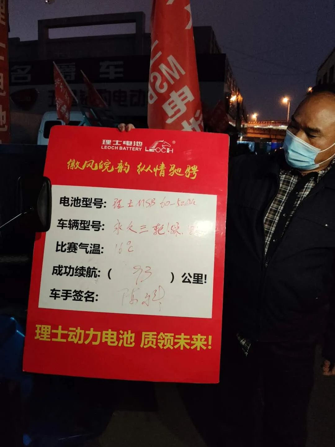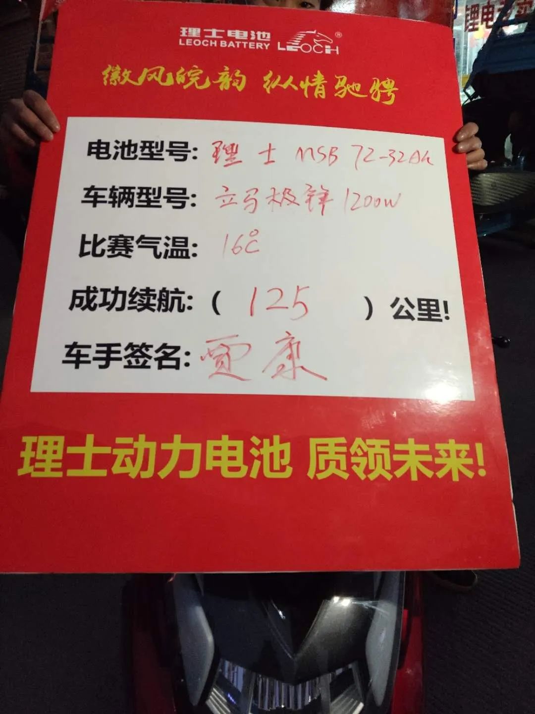 明媚的阳光下,微风卷起发丝,欢呼在耳畔响起,经过激烈比拼,骑手们肆意挥洒汗水,奋勇超越极限,最终理士MSB 72V-32Ah电池凭借其“品质优异、大容量、长续航”的高性能斩获125km极限续航的优异成绩,实力夺魁!