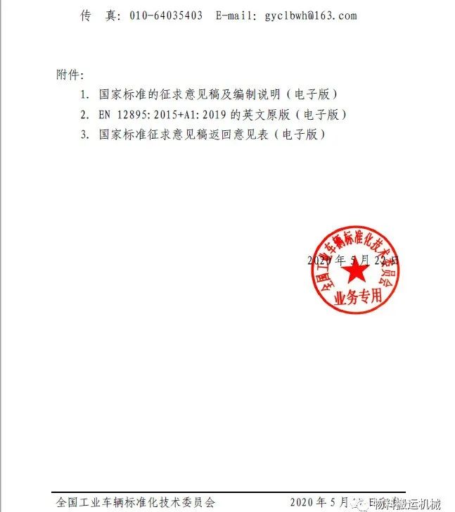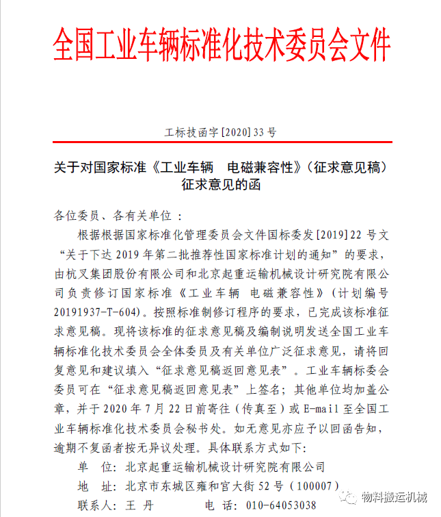 关于对国家标准《工业车辆 电磁兼容性》(征求意见稿)征求意见的函