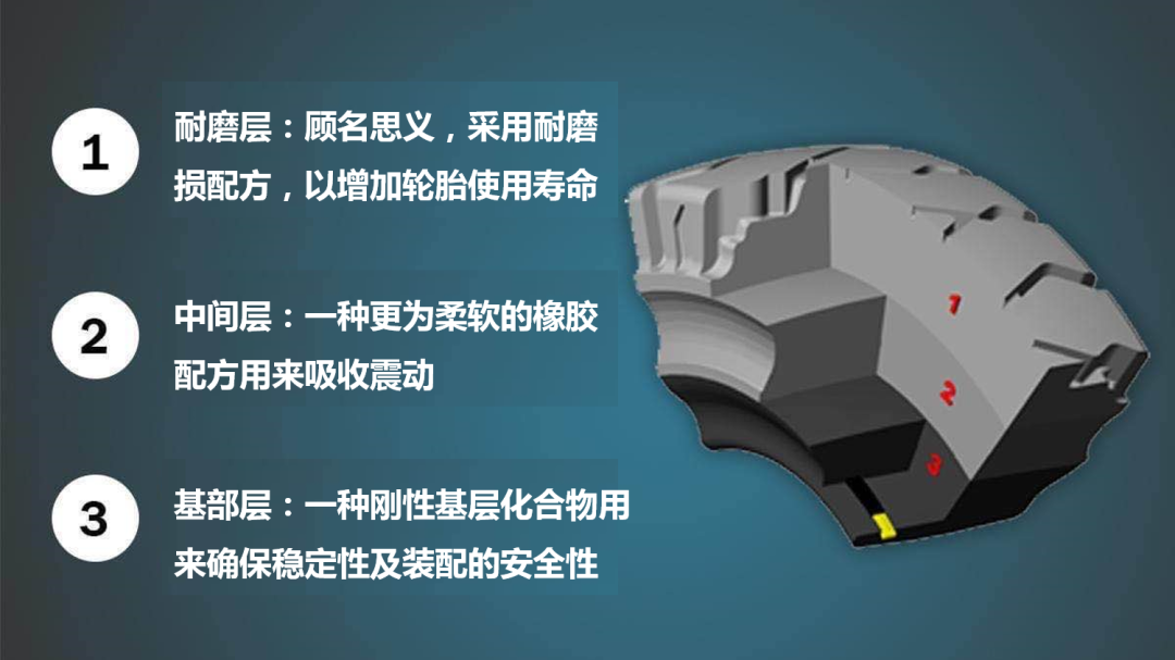 对于一条实心轮胎来讲,他的内部不是一整块橡胶,而是由三层结构叠加而成。我们将之称为:Tread layer 耐磨层,Middle layer 缓冲层以及Base layer 基部层。他们每层存在的意义各有不同,如耐磨,减震和稳定。