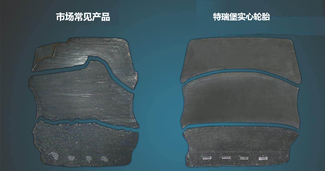 凭借卓越的研发技术和丰富的实验数据,特瑞堡将精良的工艺赋予了每一条实心叉车轮胎,从横切面的对比便可一见端倪。