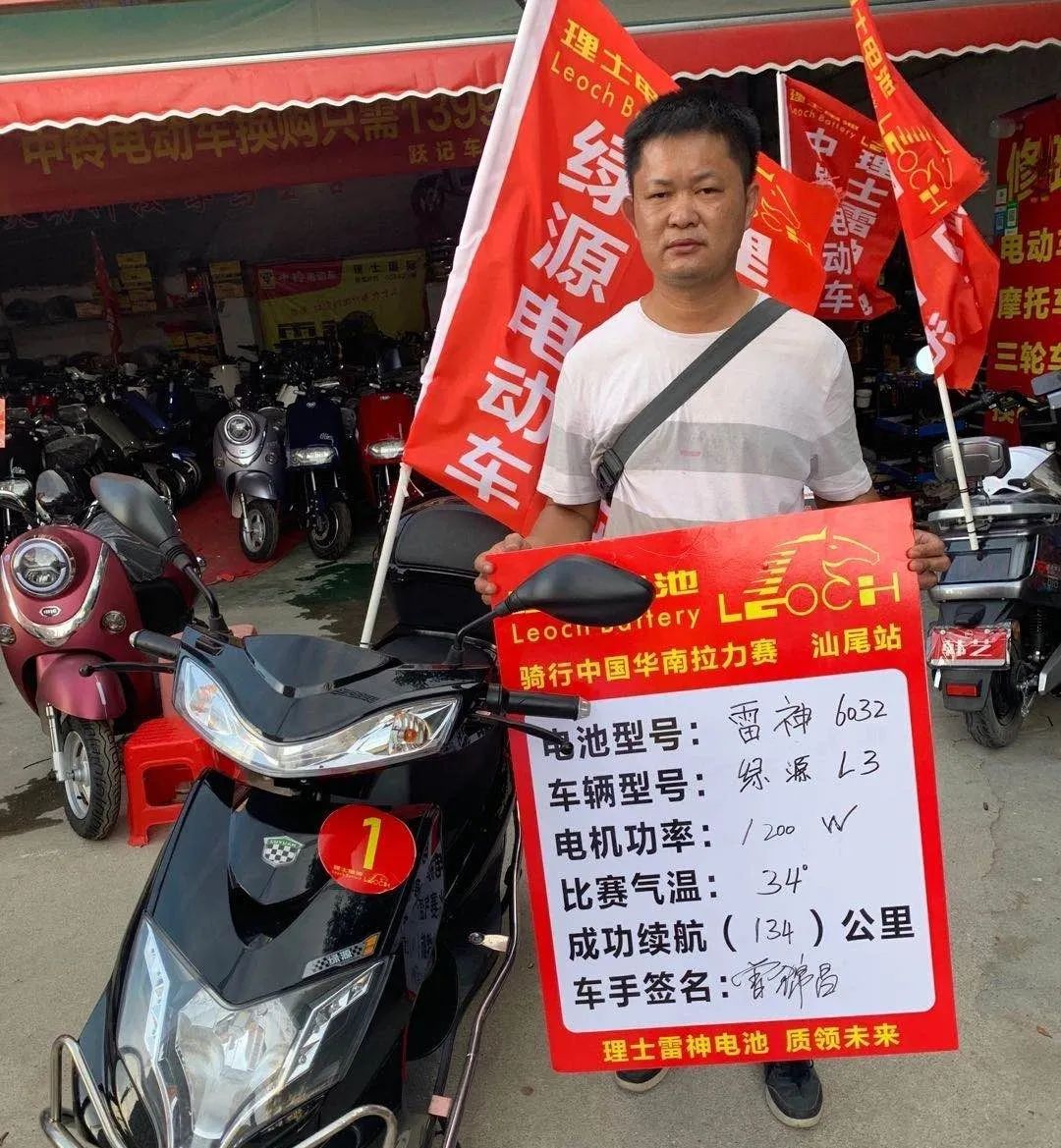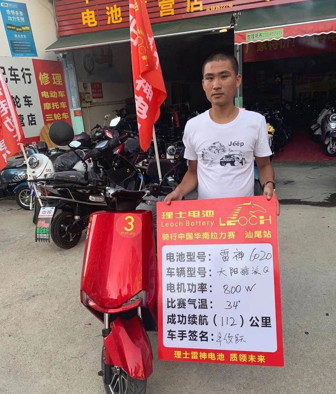 在34℃的高温下,骑手们口干舌燥,全身汗流浃背,挥汗如雨。经过近七个小时奋战,骑手们不负众望,所有车辆都取得过100+的优异成绩,拉力赛圆满结束!其中雷神60-32型号电池,搭配绿源1200w两轮车,成功续航134公里!毫无疑问成为本次拉力赛最佳续航成绩!
