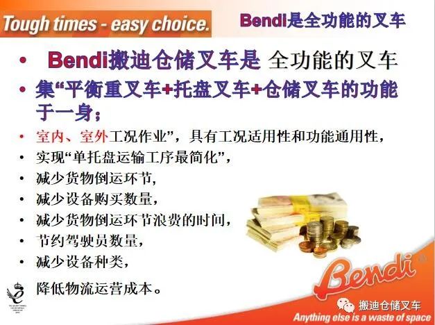 Bendi是一款全功能的叉车,所有物流环节一站到底的运营模式。适合室内外工况、窄巷道密度仓储工况、高位货架工况等物流环节,节约货物倒运环节,提高仓储和搬运环节的作业绩效。