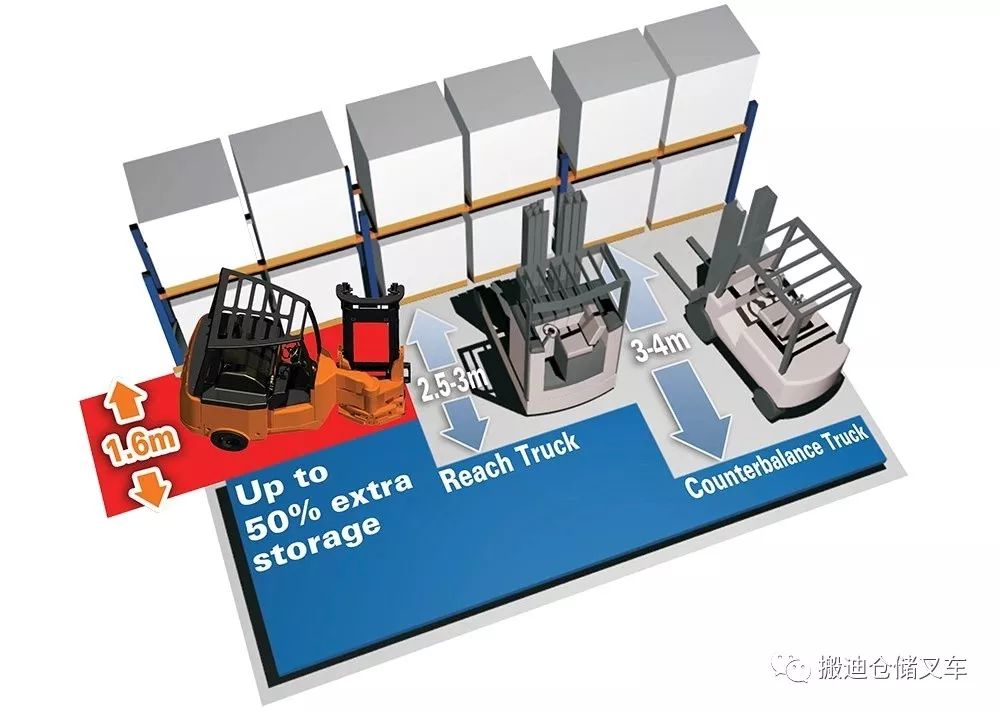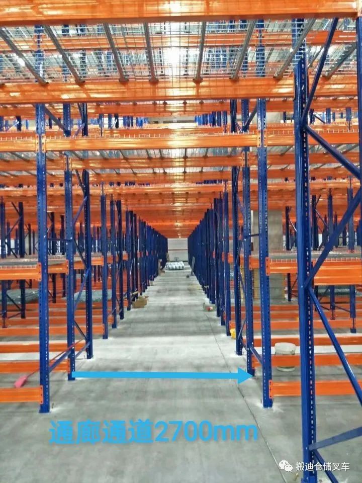 Bendi无工况限制窄巷道仓储叉车帮助用户实现“单托盘储运成本最低”&“搬运效率最高”&“设备投资最小”&“仓储利用率最高”&“运营费用最低”,Bendi穿越货架系统的通廊通道(下图)
