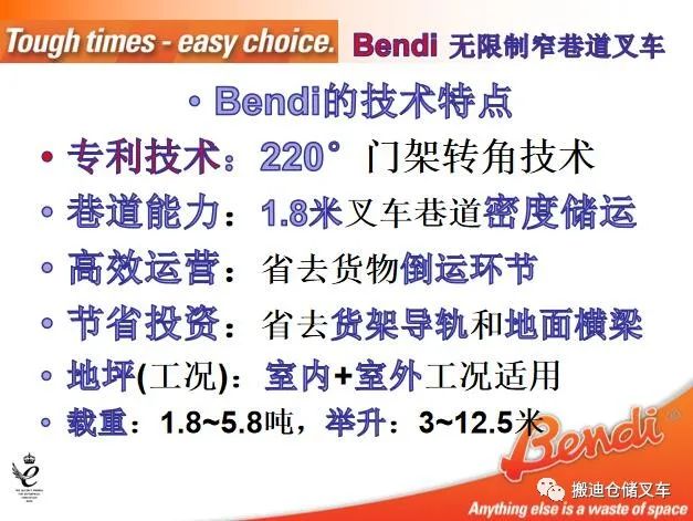 “在有限的空间极限存储货物,或者把有限的货物存储在最小空间”,具体 体现Bendi窄巷道仓储叉车的“用户价值”。