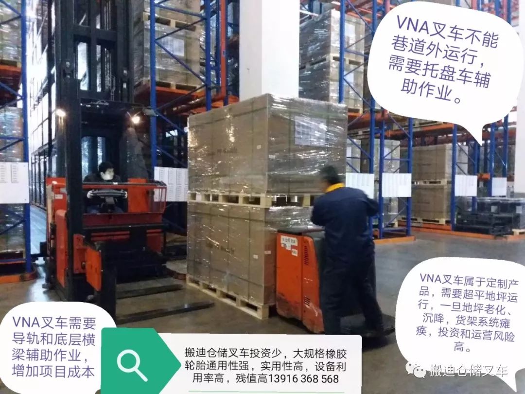 VNA叉车是定制型的设备,不具有通用性,即使增加别的类型的设备来救援,仍无法替代NA叉车的上下货架的短板;原因是:其余的设备无法进VNA叉车1.8米的巷道内作业,货物在货架系统内无法储运,造成供应链“断板”的运营风险。