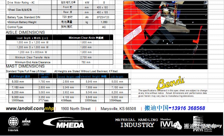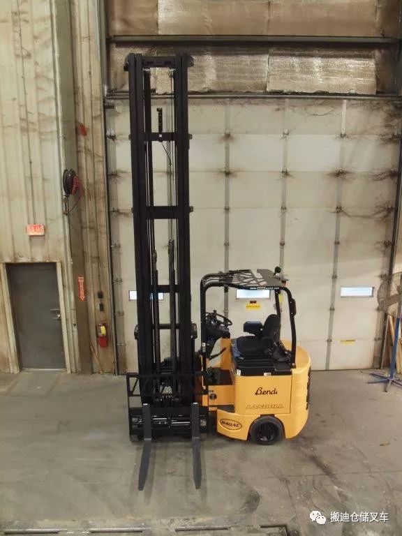 Bendi B320型,载重能力2000kg,举升高度5米-10米,侧移装置,1000mm进叉深度时作业巷道1.6米(货到货),1200mm进叉深度时作业巷道1.8米(货到货),叉车驶出巷道的拐角巷道2.7米。
