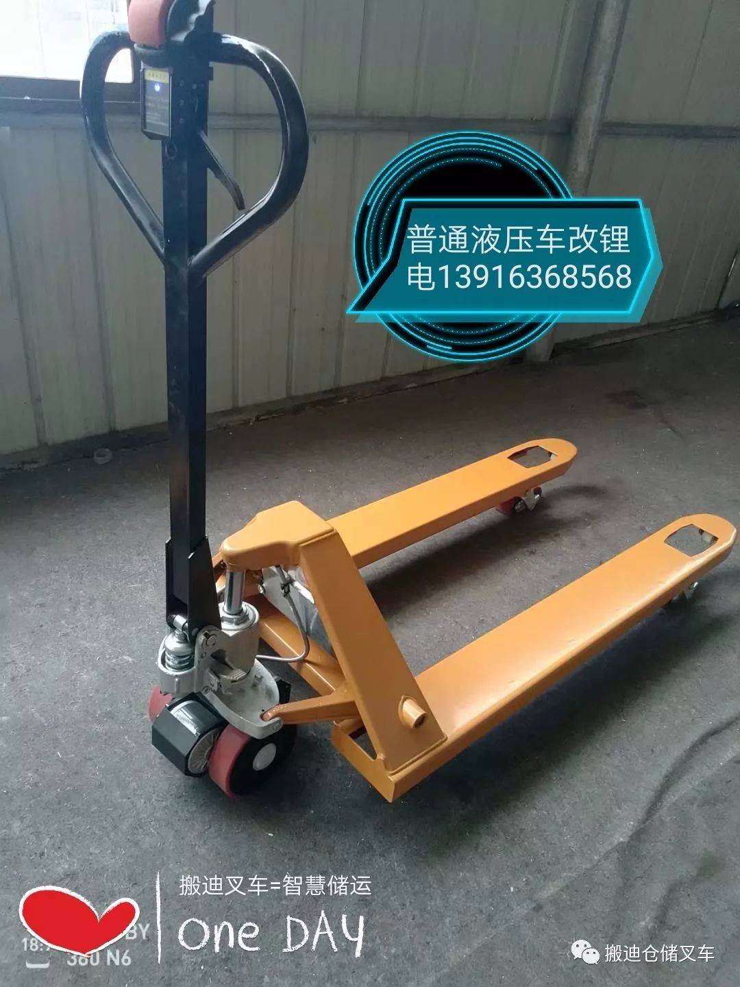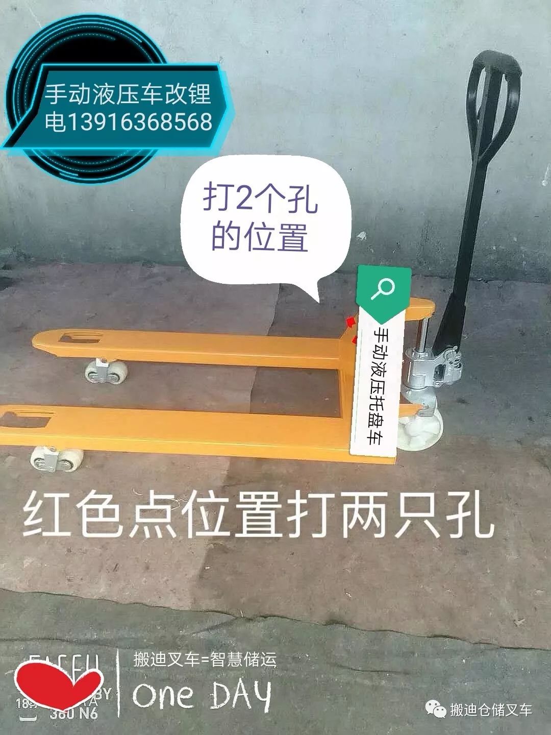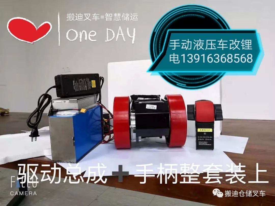 2、如果用户已经有了液压搬运车,希望进行原有的液压搬运车的技术升级,也是可以进行的,改装费用需要支付3200元(总价包含:驱动轮及驱动电机+48v锂电池+ 锂电池及充电器+升降手柄及电路系统)。改装程序如下图示: