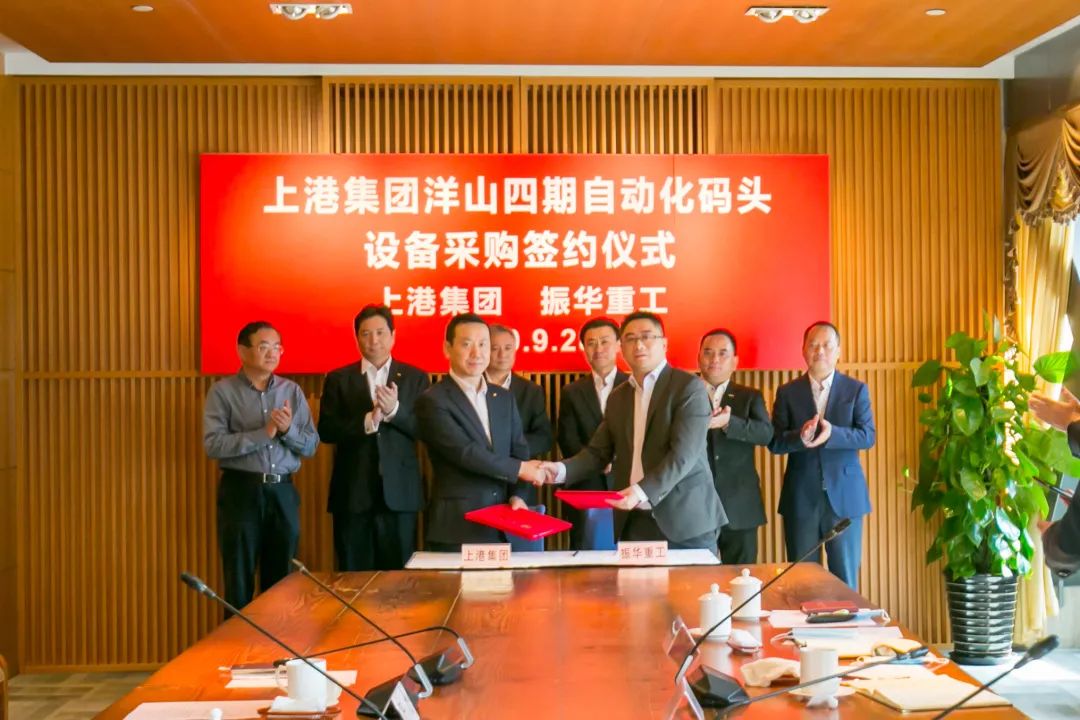 9月28日,振华重工与上港集团签订洋山四期自动化码头(末批次设备)合同,包括5台双小车岸边集装箱起重机、11台自动化轨道吊和25台自动导引小车(AGV)。上港集团党委书记、董事长顾金山,总裁、党委副书记严俊,振华重工党委书记、董事长朱连宇,总裁、党委副书记黄庆丰出席并见证签约。