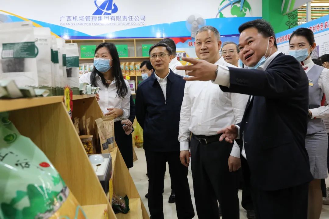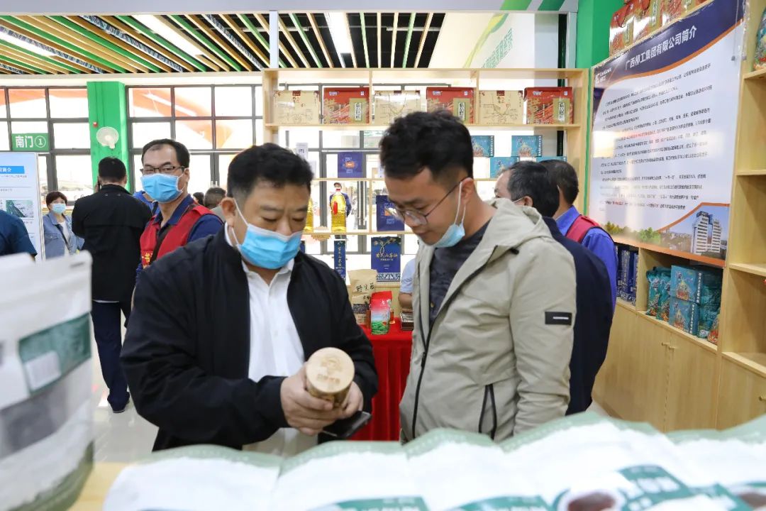 柳工集团总裁郑津应邀参加了开幕式,并向前来柳工展区参观的自治区副主席邹展业介绍柳工帮扶村的特色农产品.