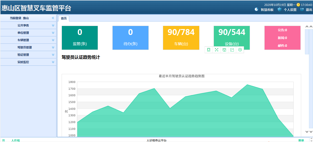 智慧叉车监管平台是通过感知装置,构建智能监控和安全防范体系。不仅能够有效弥补传统方法和技术在监管中的缺陷,并且实现对人员、设备、环境的全方位实时感知,变被动“监督”为主动“监控”。平台通过物联网技术实现对现场叉车的实时定位,有效获取驾驶员实名操作、叉车位置、时间、轨迹等数据信息,及时发现异常行为,实现监管设施的高度自动化,提高应急响应速度和事件的处置速度,形成人管、技管、物管、联管、安管五管合一的立体化管控格局,提高叉车管理水平和管理效率。此外,监管人员可以随时随地掌握叉车的使用情况,监控现场的动态,及时发现问题并督促叉车企业单位、驾驶员及时整改隐患,杜绝各种违规操作和不安全操作现象。