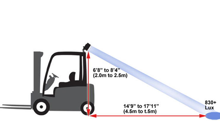 通过灯光的投影形成视觉效果,距离叉车4米左右,叉车移动过程,光源先于叉车进入行人视线,起到警示效果,提前进入戒备状态,大幅度提高了安全性。