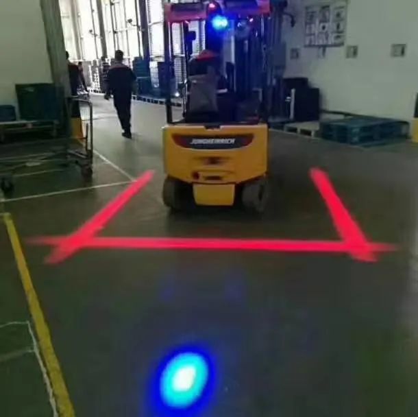 通常叉车区域灯是配合三个直线灯和一个蓝光灯使用,三条直线形成一个保护区域禁止行人靠近,蓝光灯远离车尾四米左右,作为倒车警示相对语音喇叭没有噪音污染,且颜色鲜艳醒目,警示效果更佳。