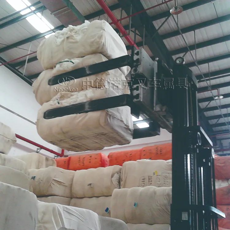 专用的设备有很多,比如中德诺克纸箱夹、纸卷夹、推拉器等等,适用于不同的作业场景。如果企业日常的搬运作业既需要托盘搬运,也有不便于使用托盘承载、堆垛的情况,比如针对布料、海绵、吨袋等软包类货物的搬运,那将叉车前叉升级为叉夹,是个合适的升级方向。
