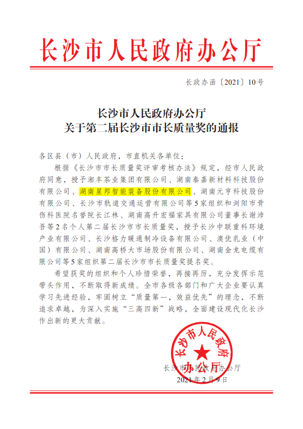 近日,湖南星邦智能装备股份有限公司(以下简称星邦智能)荣获第二届长沙市市长质量奖,此次评选由长沙市质量强市工作领导小组办公室经企业申报、资格审查、材料审核、现场评审和评委会审议等程序确定授奖名单。