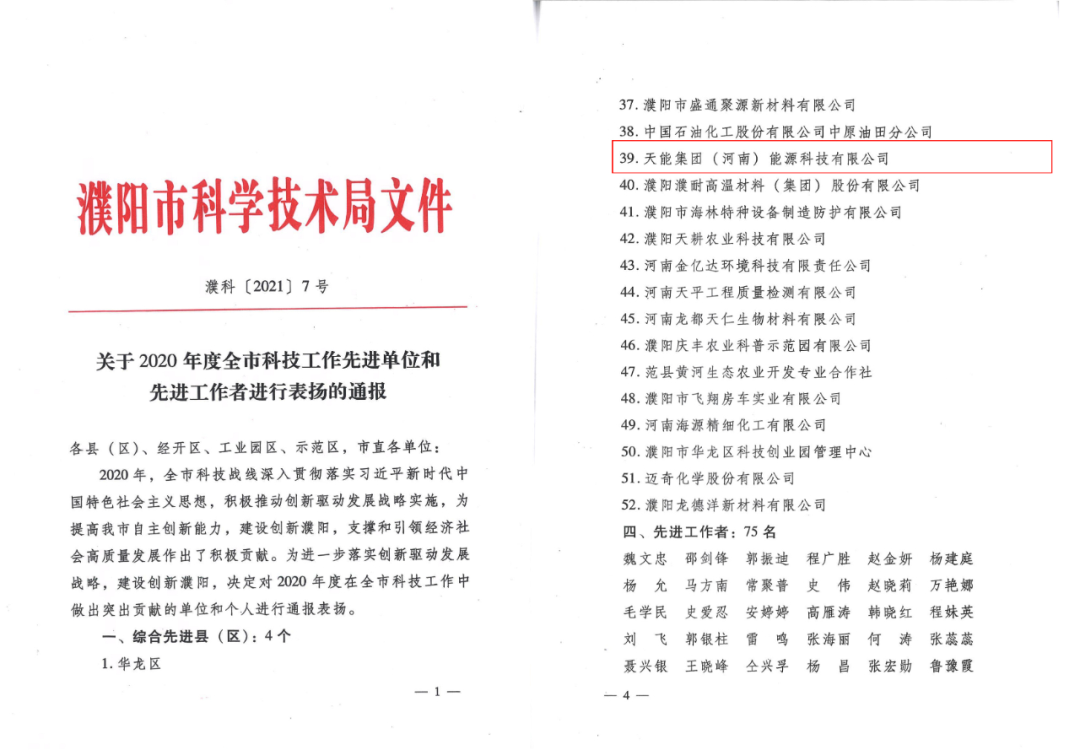 ❂【天能濮阳公司】近日,濮阳市科学技术局发布了关于2020年度全市科技工作先进单位和先进工作者进行表扬的通报,天能集团(河南)能源科技有限公司喜获“科技工作先进单位”荣誉称号。