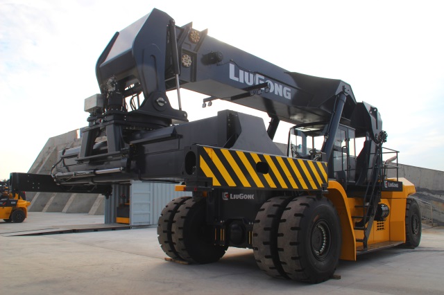 合力45T集装箱正面吊运机是集机电液为一体的高科技产品,适用于20和40英尺标准集装箱,最大额定起重重量为45吨,可堆垛5层跨三列作业,主要用于集装箱港口、铁路中转站、公路中间站以及集装箱堆场。其在整机可靠性、控制性能、稳定性、安全性、舒适性、排放等各项性能方面展示出来优良品质,得到了芜湖港用户的赞叹与信赖。