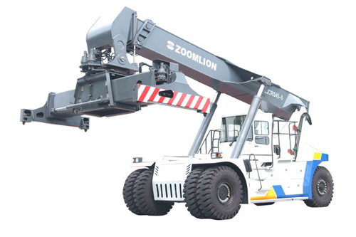 中联重科ZLJCRS45-5型集装箱正面吊运机是一种在一定范围内垂直起升和水平移动集装箱,用以完成20英尺和40英尺标准集装箱装卸、堆码和水平运输作业的集装箱装卸搬运机械,额定起重能力45吨。该产品具有外形美观、作业效率高、整机能带载行驶、带载伸缩,工作平稳可靠、安全保护功能强、驾驶舒适、操作简便等优点,适用于港口码头、集装箱堆场、集装箱货场中转站、铁路场站货运集散点的集装箱快速装卸及堆垛。