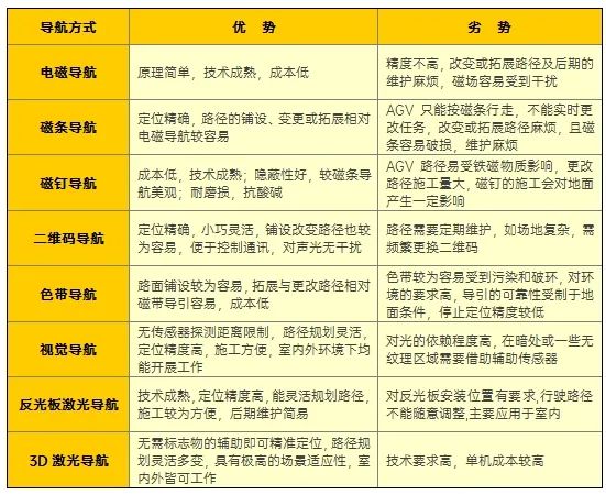 让AGV精确地知道自身位置,是AGV的核心技术之一,发展至今数十载已衍生出多种导航方式,包括电磁导航、磁带导航、磁钉导航、二维码导航、色带导航、视觉导航、反光板激光导航、3D激光导航等等,技术演变从最初的有轨导航到无轨导航,对特定标志物的依赖逐渐减少,对环境的适应性也在逐渐增强。