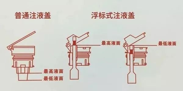 目前市面上主要分为三种注液帽:普通花篮式注液帽、浮标式注液帽及自动加水系统注液帽,不同的注液帽加水方法及液位标准各有不同,叉车蓄电池正常液位范围如下图: