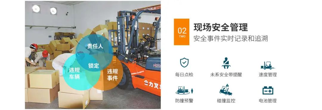 这套系统工具的硬件可以帮助叉车司机在作业现场预防超速,预防碰撞,提醒司机做好开车前的车辆例行检查、系好安全带、开车不打手机、请勿疲劳驾驶等,从源头上预防安全事故的发生。
