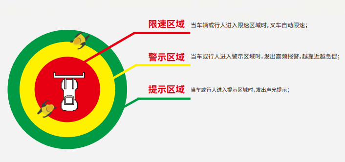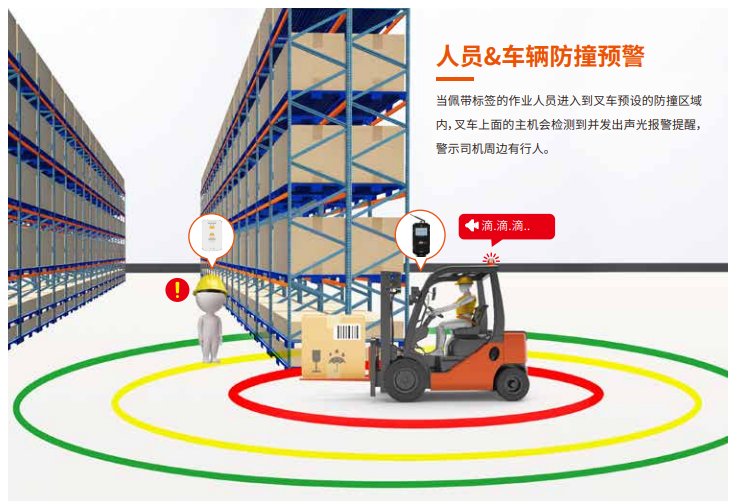工作人员佩戴感应标签,感应报警器安装在叉车上,当佩戴标签的工作人员靠近叉车的危险作业半径内时,该叉车防撞预警系统将会发出声光报警,提示叉车司机周围有人靠近请注意,也提示叉车司机要减速行驶,若配置了油门控制器,可实现自动限速功能。