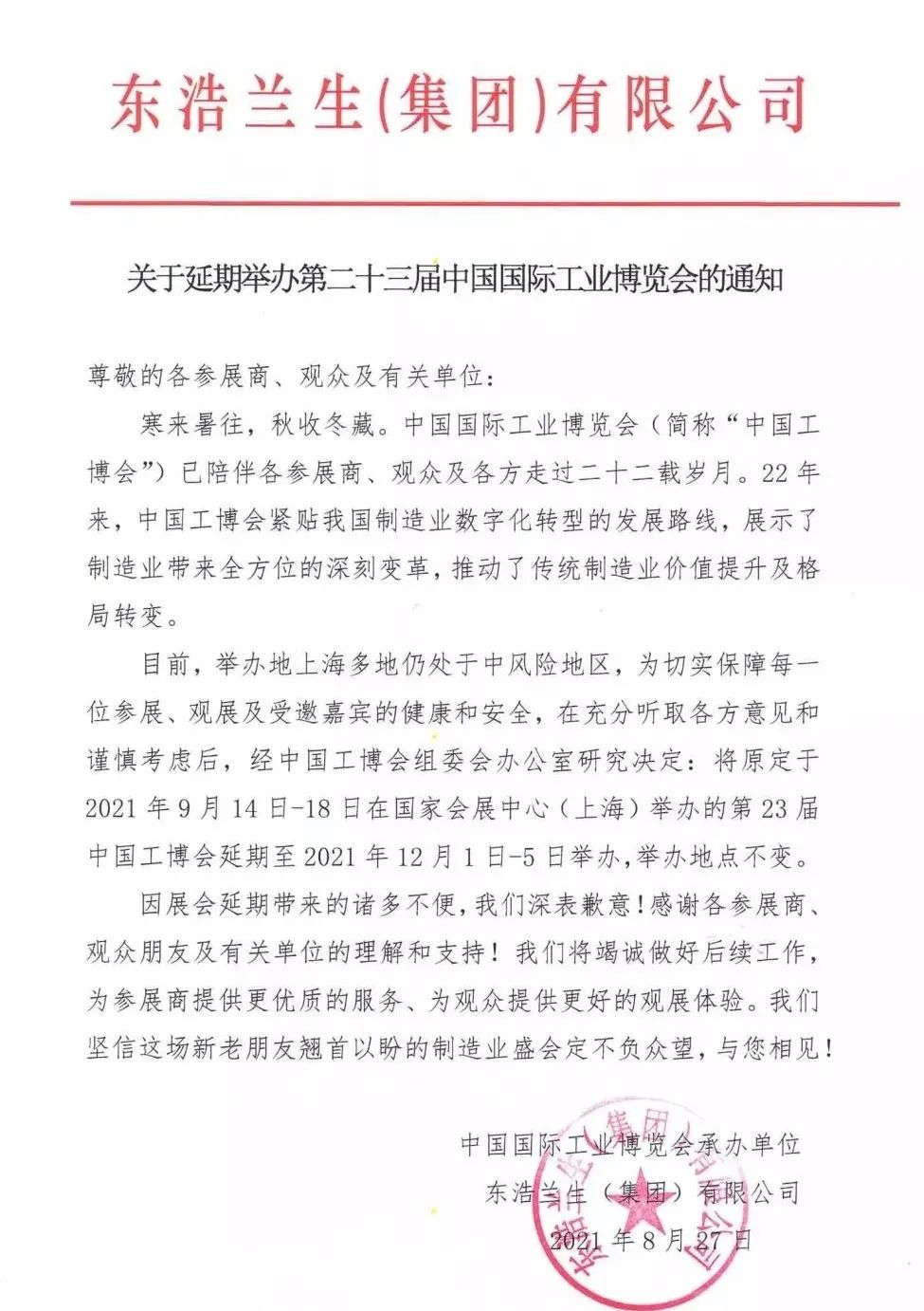 大家好!接工博会主办方正式通知,原定于2021年9月14日-18日在国家会展中心(上海)举办的第23届中国国际工业博览会将延期至2021年12月1日-5日举办,地点不变,我们仍在7.1H馆D121展位。