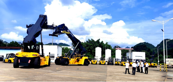在中叉网一行走进柳工叉车的当天,“柳工叉车CLG2450正面吊国内港口客户订单批量发运仪式”正在进行中,中叉网一行见证了这个有意义的仪式。 CLG 2450是柳工叉车公司自主研发生产的第一款大型港口集装箱搬运设备。柳工正面吊搭载大功率进口发动机,国际知名属具的整车平台上,经过长达近5年的开发试验及国内大客户试用,对比同类产品品牌表现出毫不逊色的高质量及高可靠性,具有优异品质以及使用时的优异体验,针对不同气候、工况、地形,柳工正面吊的性能都能良好的适应,工况灵活度及适应性强。不仅在国内市场上受到好评,在国际市场上市伊始迅速征服了美洲及亚太客户,为之后的产品拓展打下坚实海外客户基础。柳工的正面吊是柳工叉车重型新产品研制的重要里程碑,为柳工大型化设备家族增添了实力干将。在CLG2450正面吊交车仪式上,研发部和重车销售人员齐聚合影,在蓝天白云的映衬下,更增添了柳工叉车不断拓展、革新重型物料搬运行业,为行业带来日新月异变化的决心。