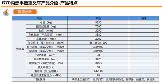 G70内燃平衡重叉车:标准工况设计,稳重耐用,节能高效。电控单体泵发动机、液力变速箱手动液力换向、全液压助力制动系统,制动能力强劲。