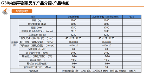 G30内燃平衡重叉车:标准工况设计,舒适耐用,灵活高效。电控分配泵发动机、悬浮式变速箱电液换向(高端车)、铸造一体式减震转向桥。