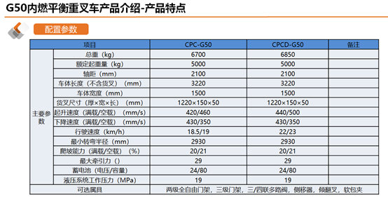 G50内燃平衡重叉车:标准工况设计,稳重耐用,节能高效。电控单体泵发动机、液力变速箱手动液力换向(选配)、全液压助力制动系统,制动能力强劲。