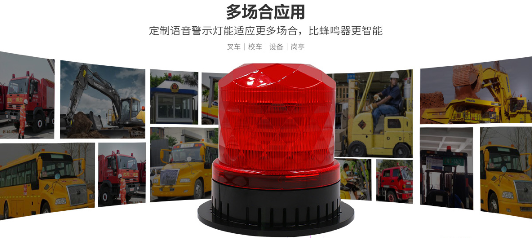 铁路货场、物流基地的装卸机械,不仅有叉车,还有装载机、起重机、正面吊等大型机械,部分大型机械不适宜安装叉车限速器的,也应该安装车载声光警示灯,通过语音报警+灯光闪烁,声光一体双重警示的方式,提醒车辆周边的工作人员,车辆行驶中、倒车中或转弯中。