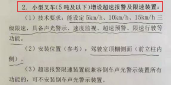 2、小型叉车(5吨及以下)都要增设超速报警及限速装置。