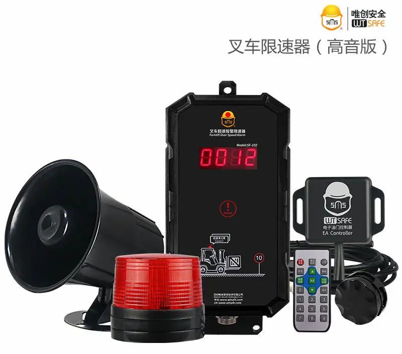 一套完整的叉车超速报警器,标配有:主机、声光报警器、无线/有线传感器、遥控器、主干线、安装配件,选配有:机械油门控制器/电子油门控制器。