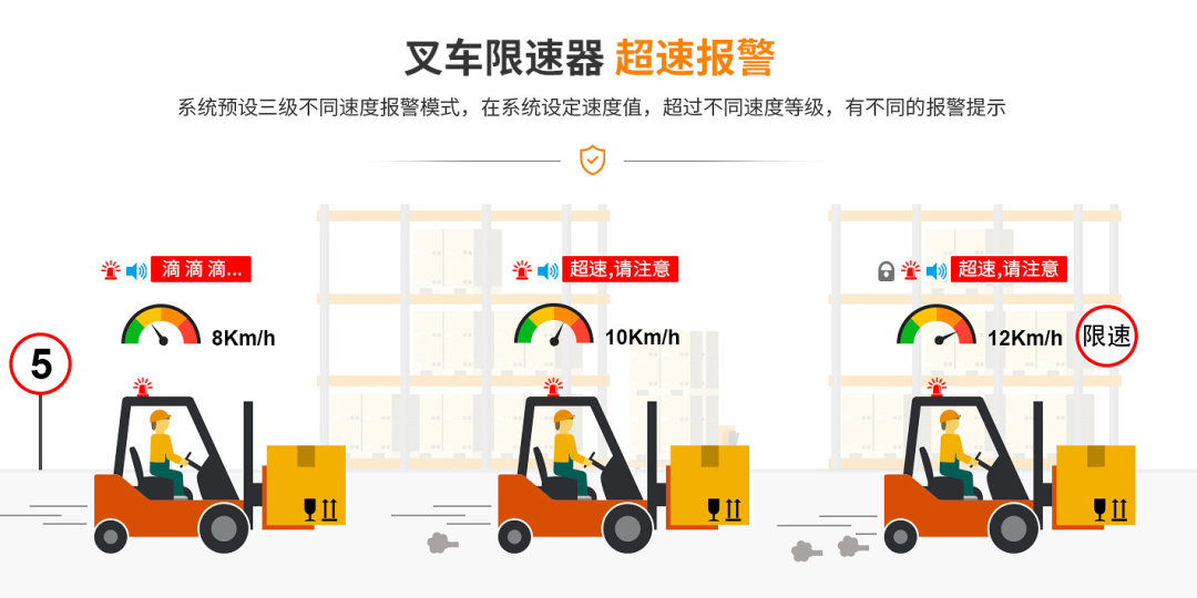 唯创安全叉车超速报警器可以预设三级不同速度报警模式。超过不同设定速度发出对应报警。若选配了油门控制器,当车辆速度超过设定的限速值时,车辆便会自动启动限速管理。即便叉车司机猛踩油门,叉车行驶速度也不会超过预设值。