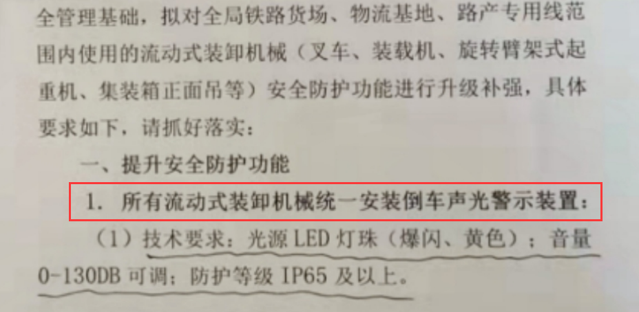 1、所有流动式装卸机械都要安装倒车声光警示装置(LED灯珠、防护等级IP65)。