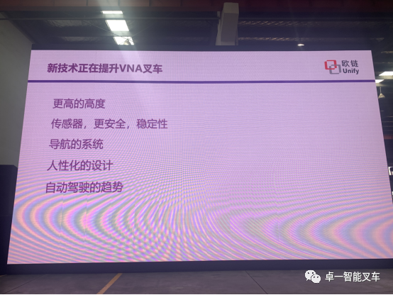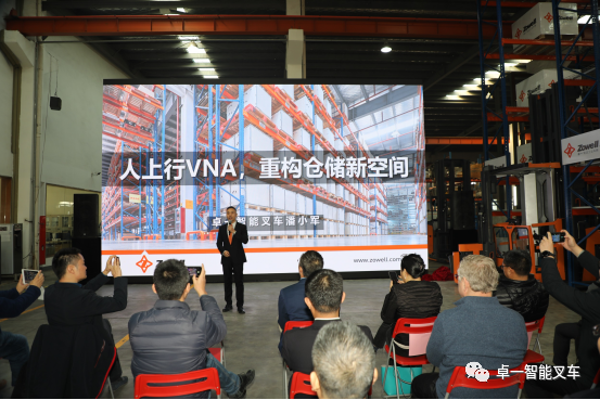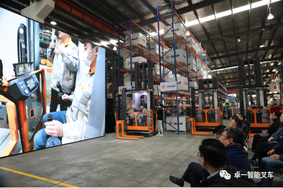 会议第二版块,迎来了最激动人心的时刻,4台卓一VUE人上行三向车盛装列队,在主持人倒计时后正式揭开神秘面纱,卓一智能叉车总经理、窄巷道产品研发总监通过PPT和现场操作演示对人上行三向车进行了重点讲解,从静态结构到动态性能,干货满满,显示出卓一智能叉车在人上行三向车研发、制造上的匠心和决心。