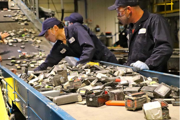 工人们在多伦多附近的Li-Cycle回收设施对锂离子电池进行分类。工人们在多伦多附近的Li-Cycle回收设施分拣锂离子电池。照片。Li-CYCLE